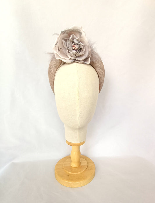 Diadema de fiesta gris con flor grande, Tocado elegante gris y rosa de tela para invitada, Diadema gris para boda.