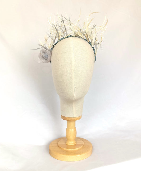 Diadema tocado de plumas gris marfil – Invitada elegante y ligera.