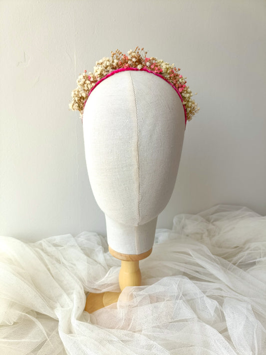 Diadema de flores preservadas en tonos rosa, blanco y beige
