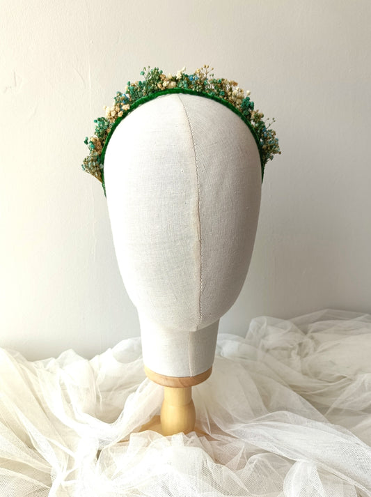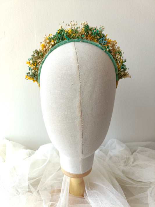Diadema bohemia de flores preservadas en tonos suaves y alegres.