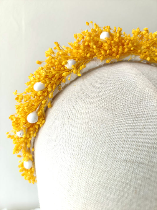 Diadema bohemia con flores preservadas en amarillo y blanco