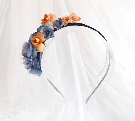 Diadema de flores de seda en azul y naranja, diseño elegante y romántico para invitada de boda o evento especial.