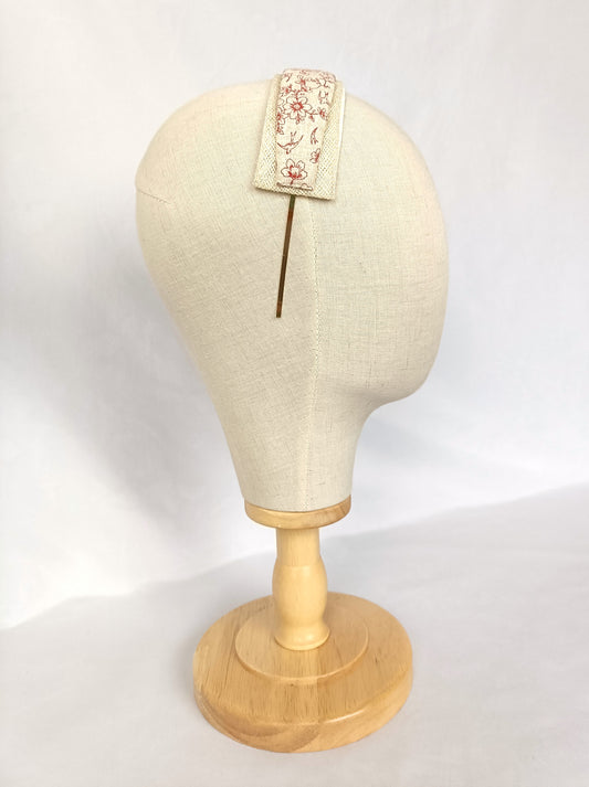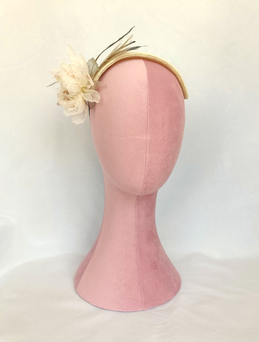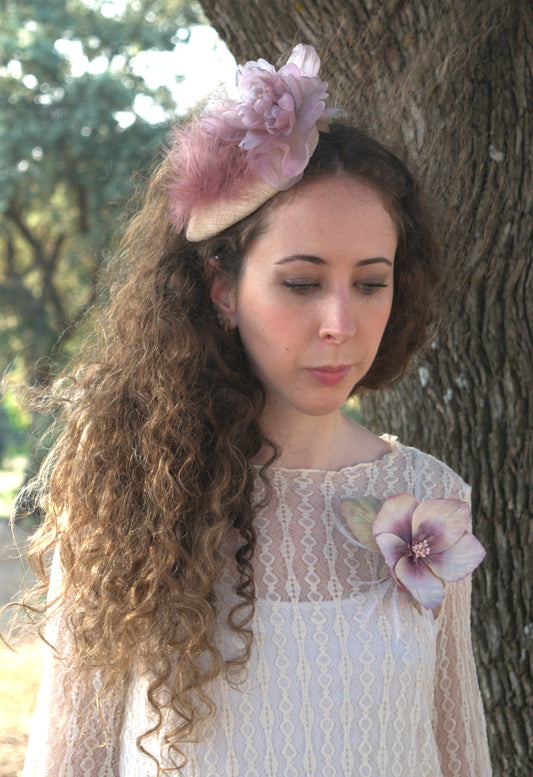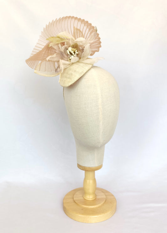 Tocado elegante beige de sinamay con flor de seda para bodas.