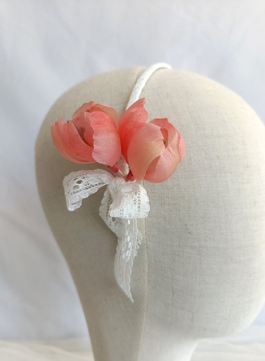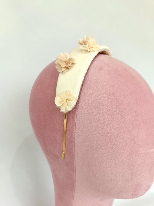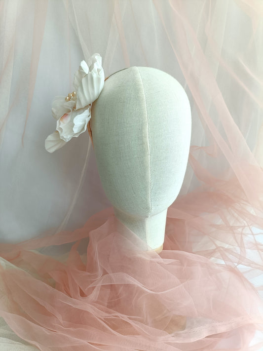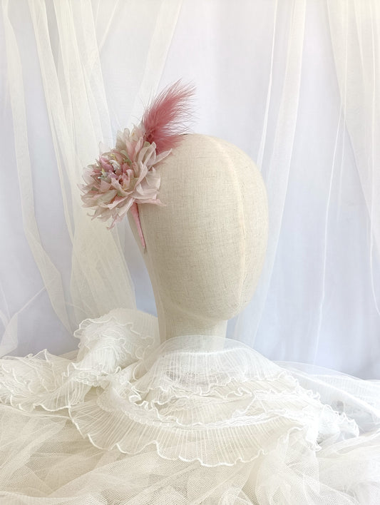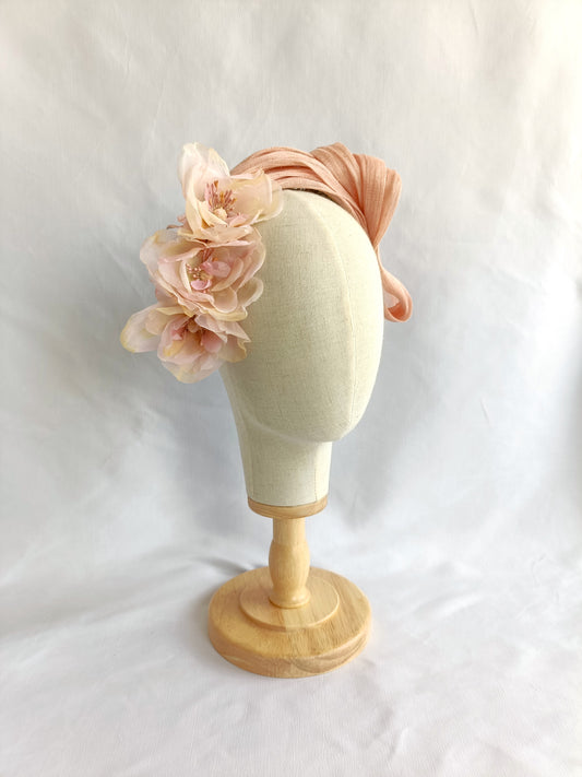 Diadema tocado en rosa palo con flores de organza, diseño elegante y romántico para invitada de boda o evento especial.