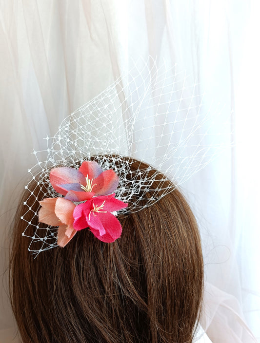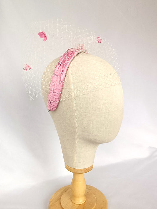 Elegante tocado de seda rosa para invitada, fascinator rosa con velo para boda, tocado rosa con velo blanco y flores para fiesta.