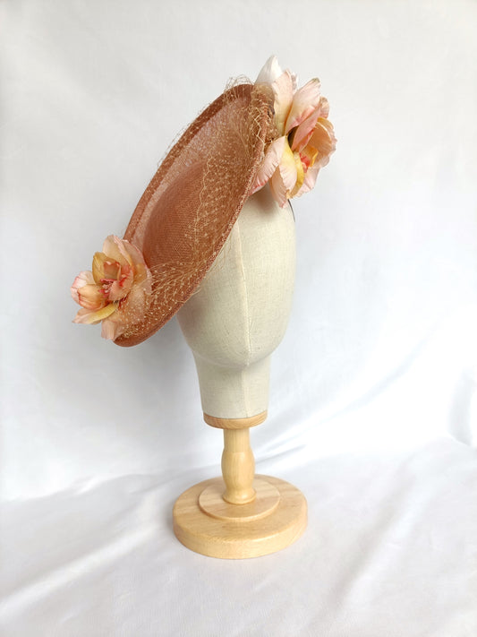 Tocado de Invitada con Flores de Seda Salmón, Base de Sinamay Rosa Empolvado, Estilo Romántico y Elegante para Boda o Evento.