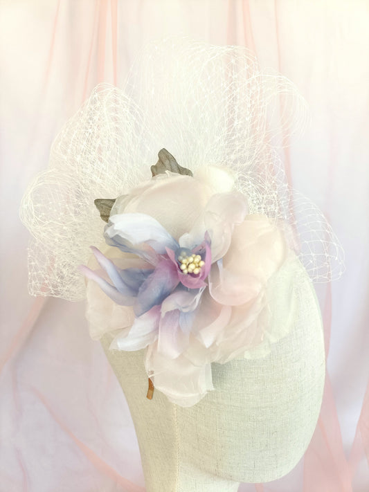 Tocado con flor morada y velo blanco, Mini sombrero con flor grande de organza lila, Tocado de hada rosa y morada para boda, Tocado floral para invitada.