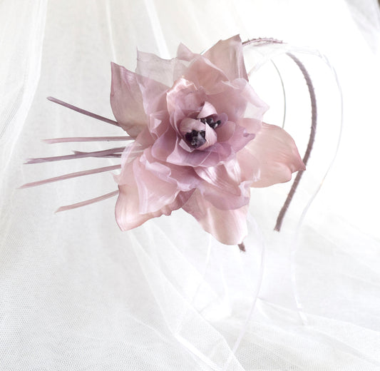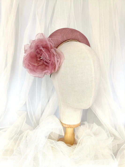 Diadema con flor rosa para boda, Tocado para madrina. Diadema floral para invitada. Flor de seda para el pelo.