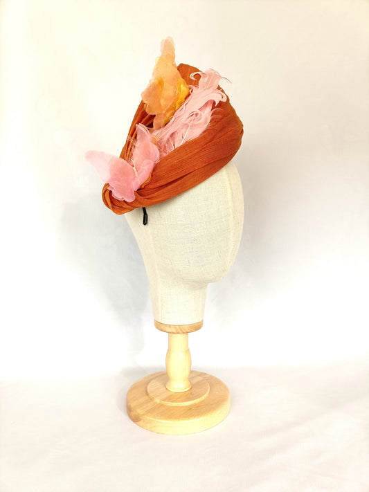 Tocado naranja con mariposas, tocado para invitada de boda con mariposas rosas y naranjas, mini sombrero melocotón para fiesta con mariposas.