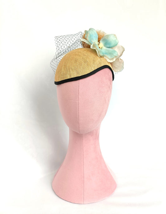 Tocado pamela de invitada en sinamay snaranjado, flores de seda azules y amarillas, con velo decorativo, elegante y colorido para boda.a