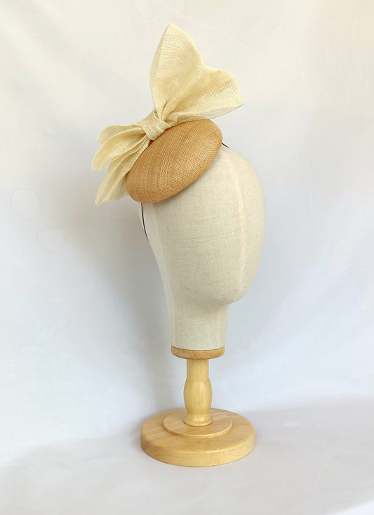 Tocado tipo botón en sinamay natural con lazo marfil – Elegante, rústico y coqueto para invitada de boda o evento de verano