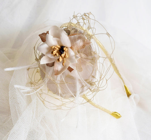 Tocado- fascintor crema y dorado para invitada, Tocado redondo con velo para dama de honor, Tocado pequeño para novia, Tocado marfil con plumas.
