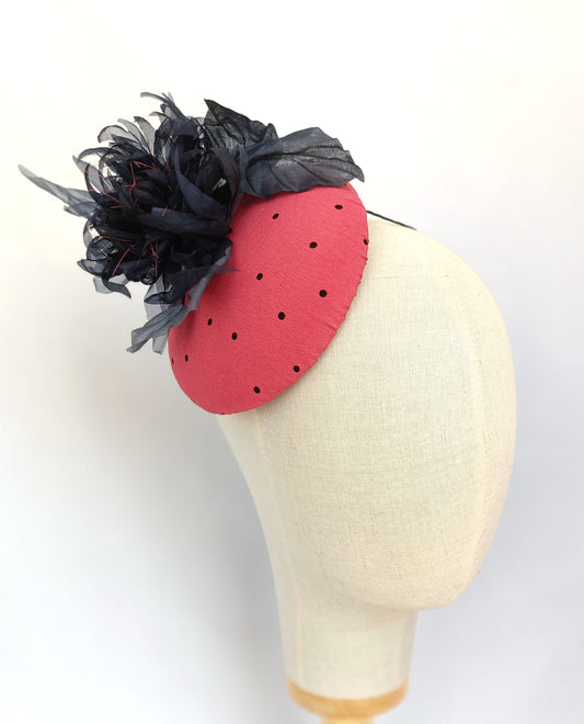 Tocado botón rosa con lunares con adorno de flor de seda.