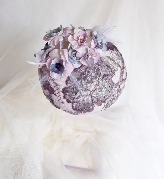 Tocado beige y encaje para boda. Tocado redondo de seda con flores y plumas. Tocado elegante para madrina.