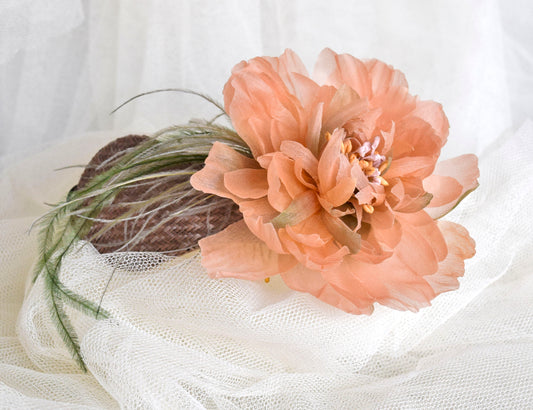 Tocado con flor de seda en color salmón para boda. Tocado con dalia y plumas para invitada. Peineta con flor elegante par boda. Accesorio con flor naranja.