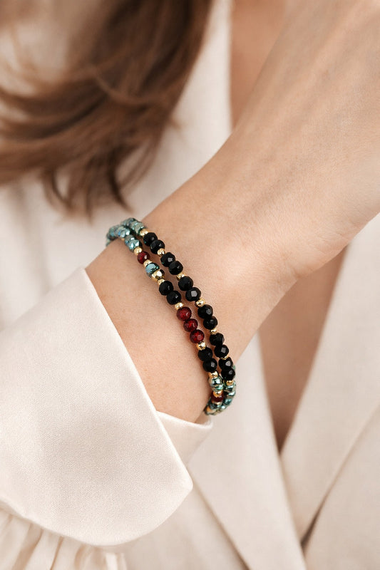 Pulsera doble de vidrio verde, rojo y negro.