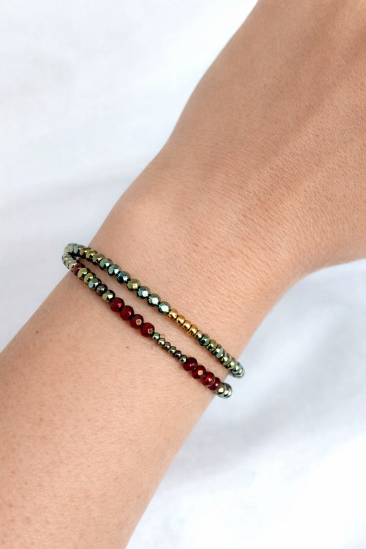 Pulsera doble de cristal rojo, verde y dorado.