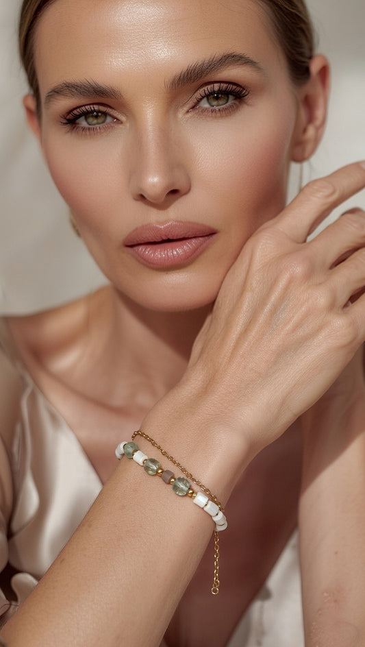 Pulsera doble de cristal en tonos bronce y blanco.