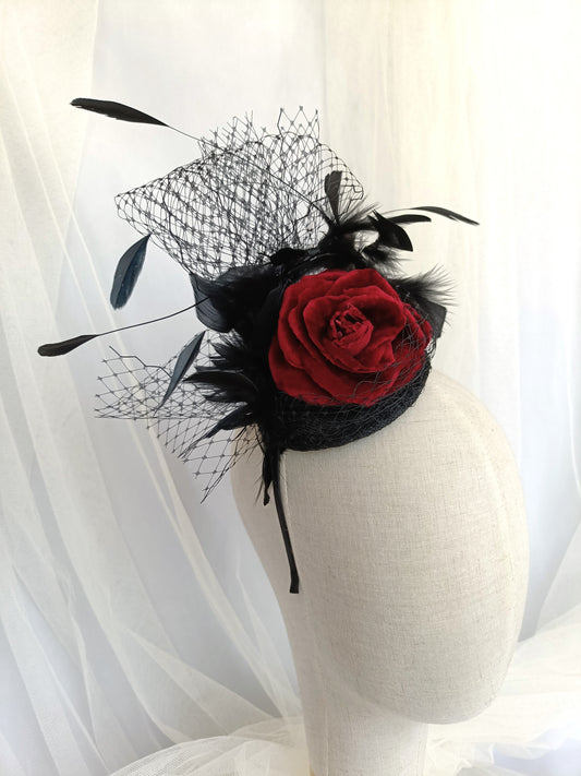 Tocado negro con flor de terciopelo rojo, plumas y velo decorativo, estilo elegante y vintage para invitada de boda.