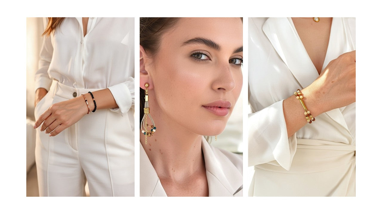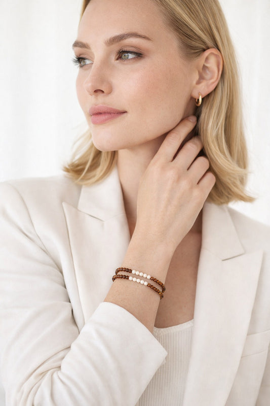 Pulsera doble de cristal en tonos bronce y blanco.