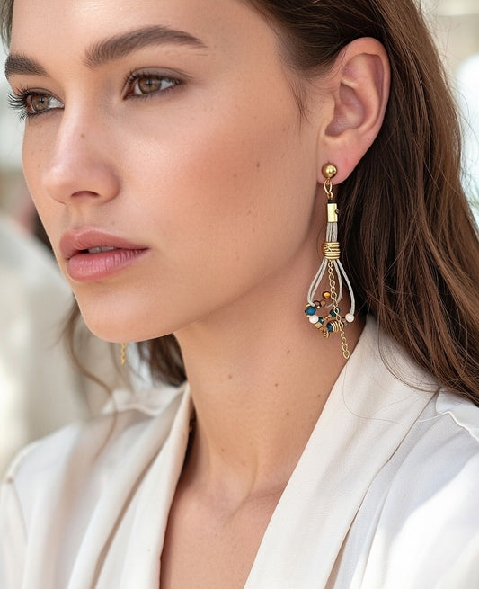 Pendientes de hilo de lino con cuentas en tonos azul y dorado.