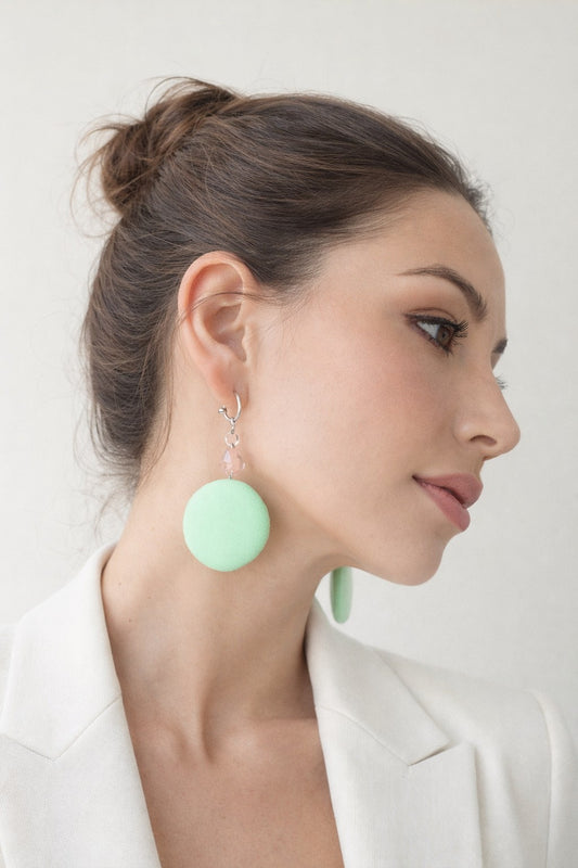 Pendientes redondos de seda verde con cuarzo sandía.