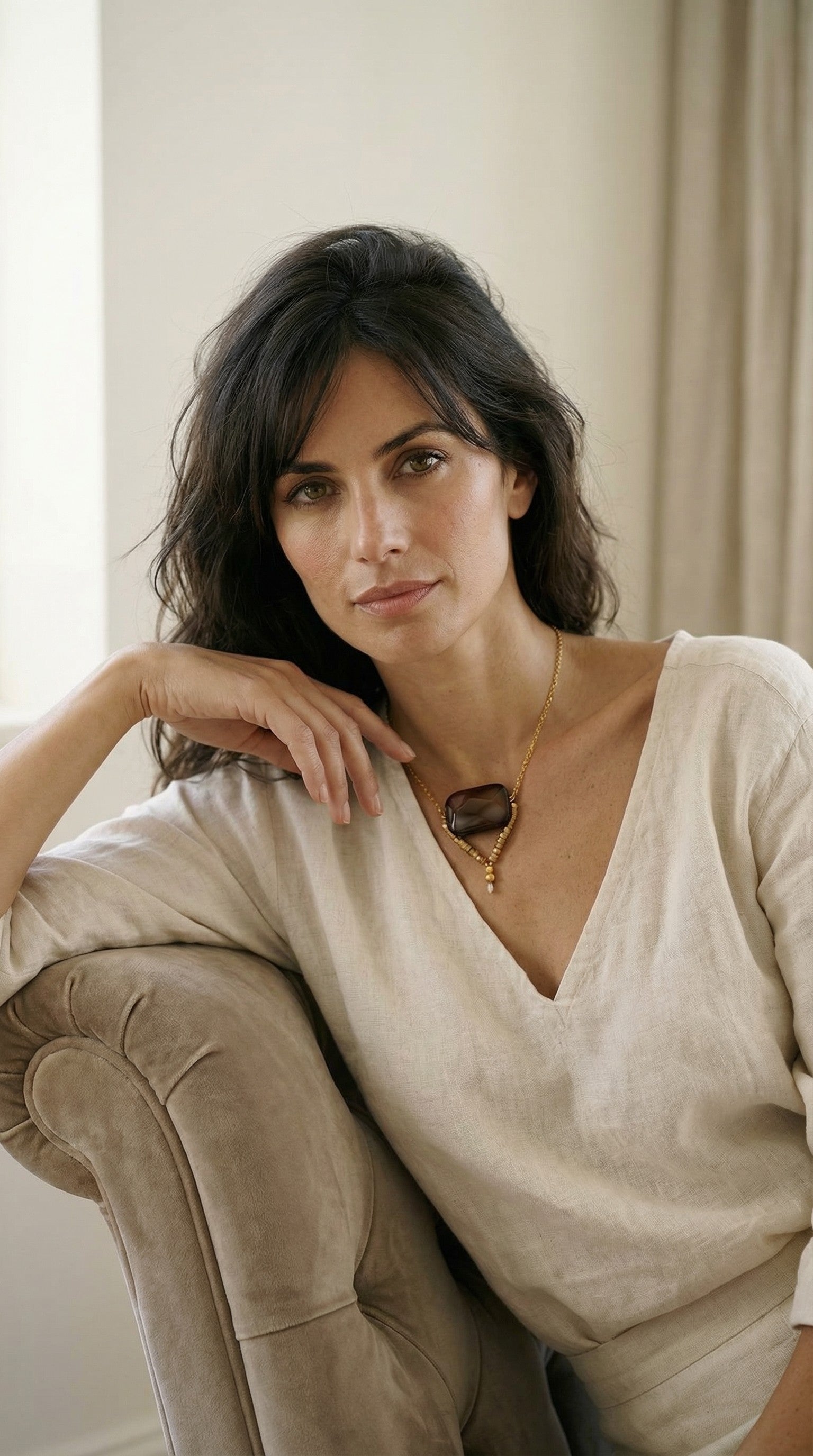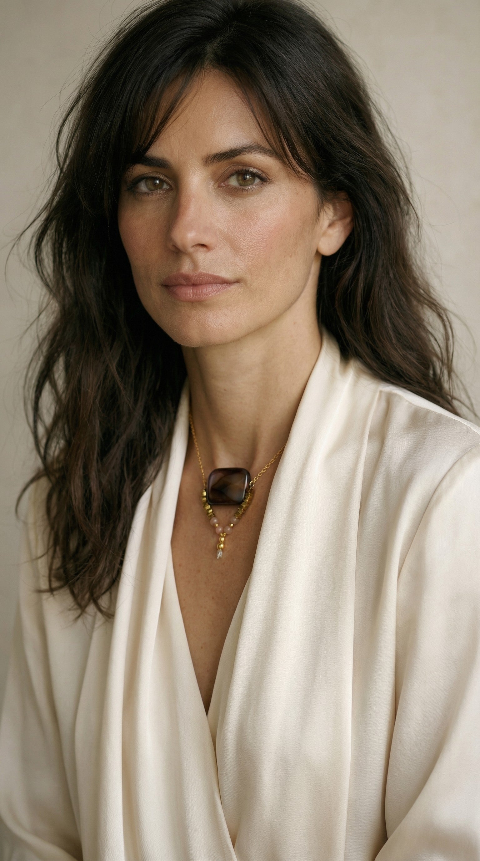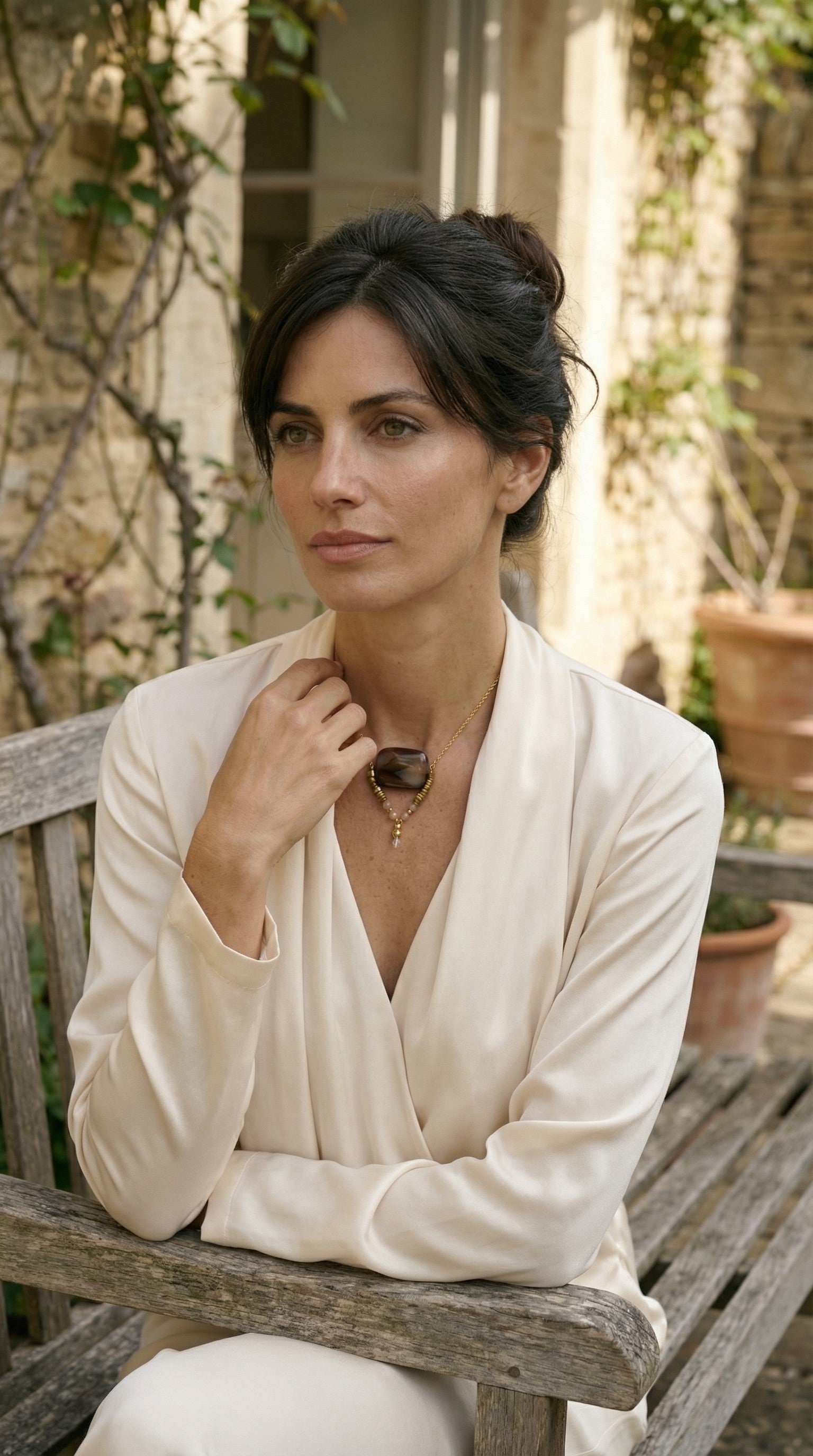 La pieza central es una piedra de ágata pulida, de tonos profundos con suaves vetas rosadas que le aportan matices únicos. Cada piedra tiene su propio dibujo natural, lo que hace que cada collar tenga una personalidad ligeramente distinta.