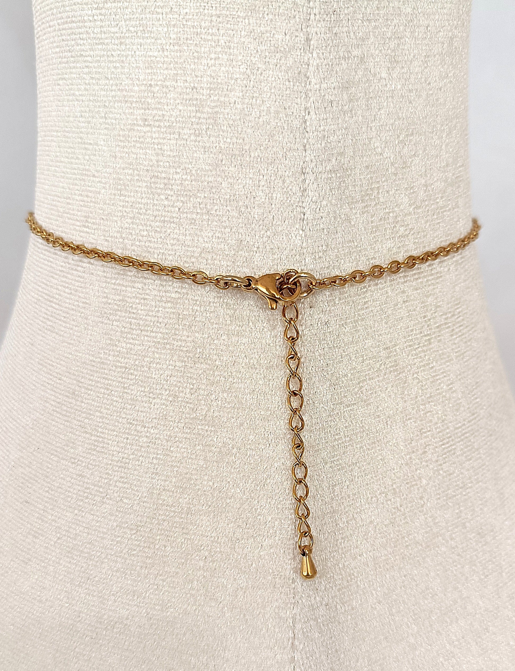 La cadena y el cierre de mosquetón están realizados en acero inoxidable, lo que aporta resistencia y comodidad para el uso diario. El collar se sitúa cerca de la base del cuello, destacando la piedra central y enmarcando el escote con discreción.