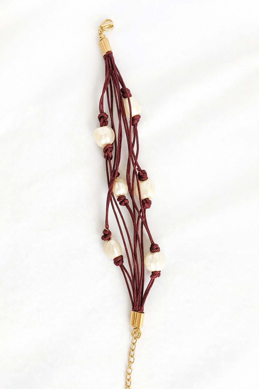 Pulsera de hilo de lino granate con perlas de agua dulce.