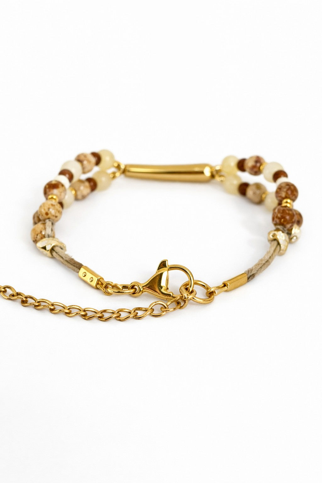 Esta pulsera doble está realizada en nuestro taller con hilo de lino, combinando cuentas de jade, angelita y vidrio en una armonía de tonos tostados, beige y dorado.