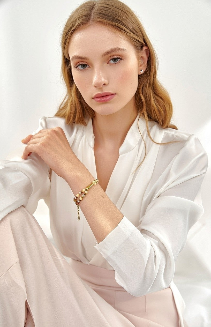 El diseño se centra en una pieza ovalada de acero inoxidable en acabado dorado, que aporta estructura y un punto de luz elegante al conjunto. La mezcla de materiales y colores da como resultado una pulsera equilibrada, luminosa y fácil de llevar.