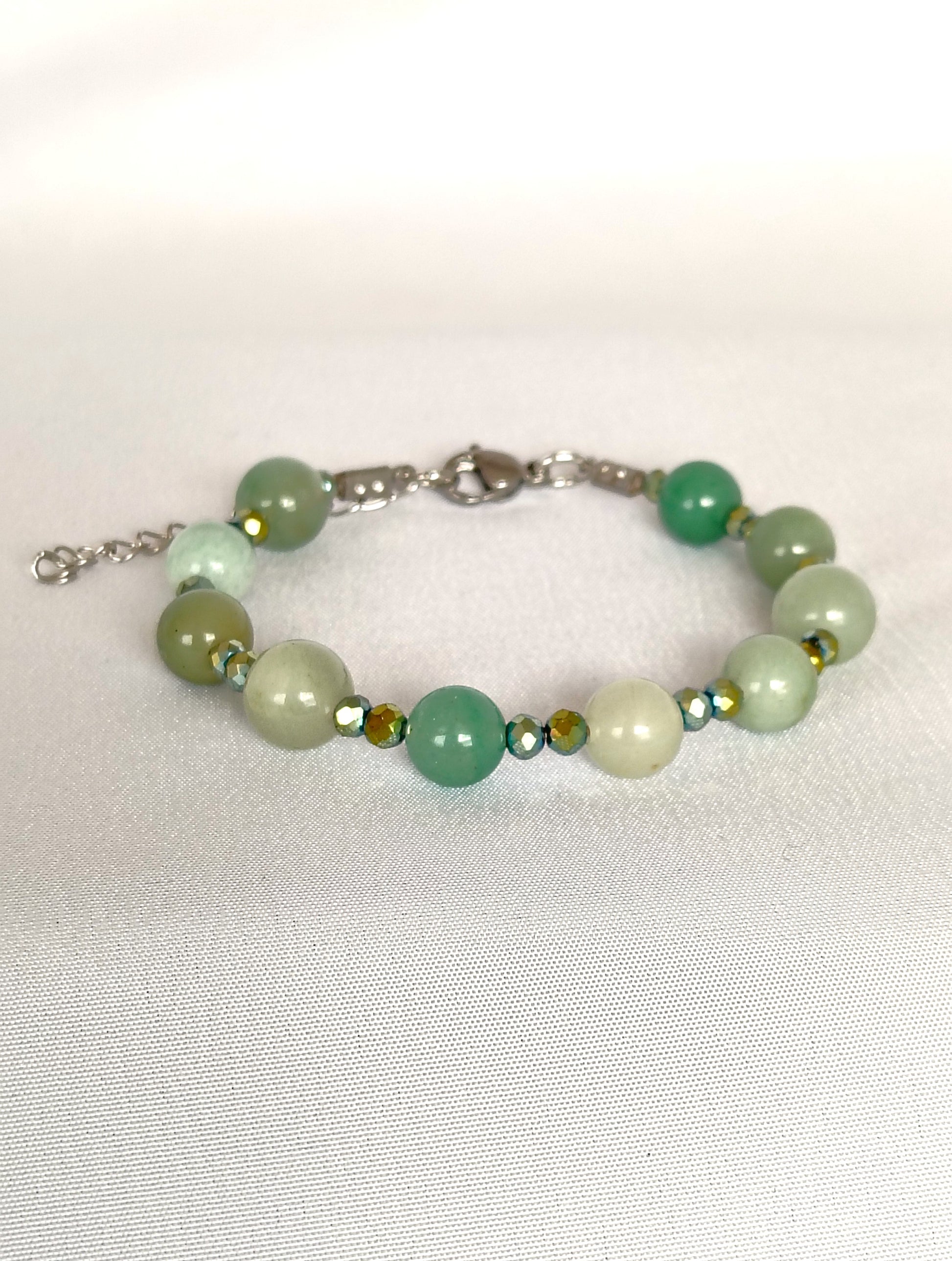 Combina cuentas de cuarzo en tonos verdes con pequeños cristalitos facetados que aportan un brillo delicado y muy actual, creando una pieza equilibrada, fresca y fácil de llevar.